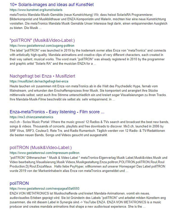 Da SolarisRA ein Programmierer der ersten Stunde des Internet gewesen ist, er war 13 Jahre älter als ich, hatte er einige tolle Websites für unsere Projekte gebaut, auf denen unsere Gäste auch interaktiv mitwirken konnten. Auf einer dieser Seiten wurden die Erfahrungs- und Erfolgsberichte der Menschen veröffentlicht, welche ihre Eindrücke und Erlebnisse schilderten, die sich während und nach den Politron-Sessions einstellten, und es waren teilweise wirklich hochinteressante Berichte, die uns von ganz lieben Menschen aus dem gesamten D-A-CH zugetragen wurden.